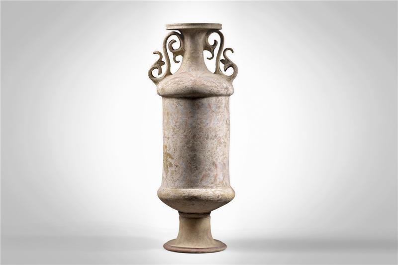 White slip Greek amphora with volute handles and stylized cylindrical body. Elongated and flared base tapers up towards vessel’s chamber. Mouth rises from narrow neck to a flared mouth.