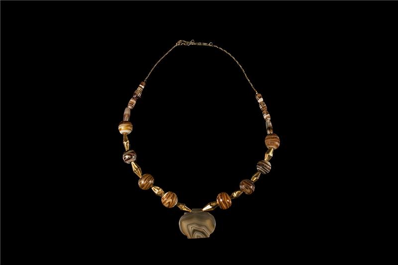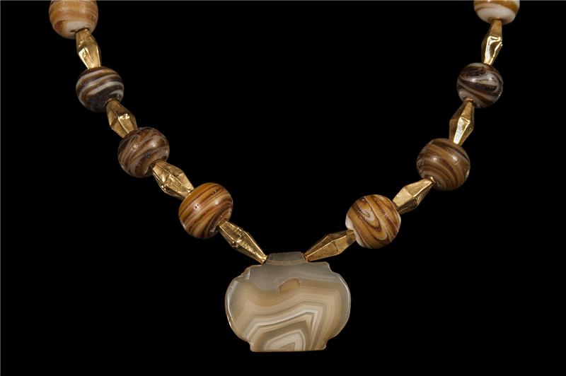 A very beautiful Byzantine banded multi shaped Agate beads necklace with 22 K gold leaf covered diamond shaped inserts